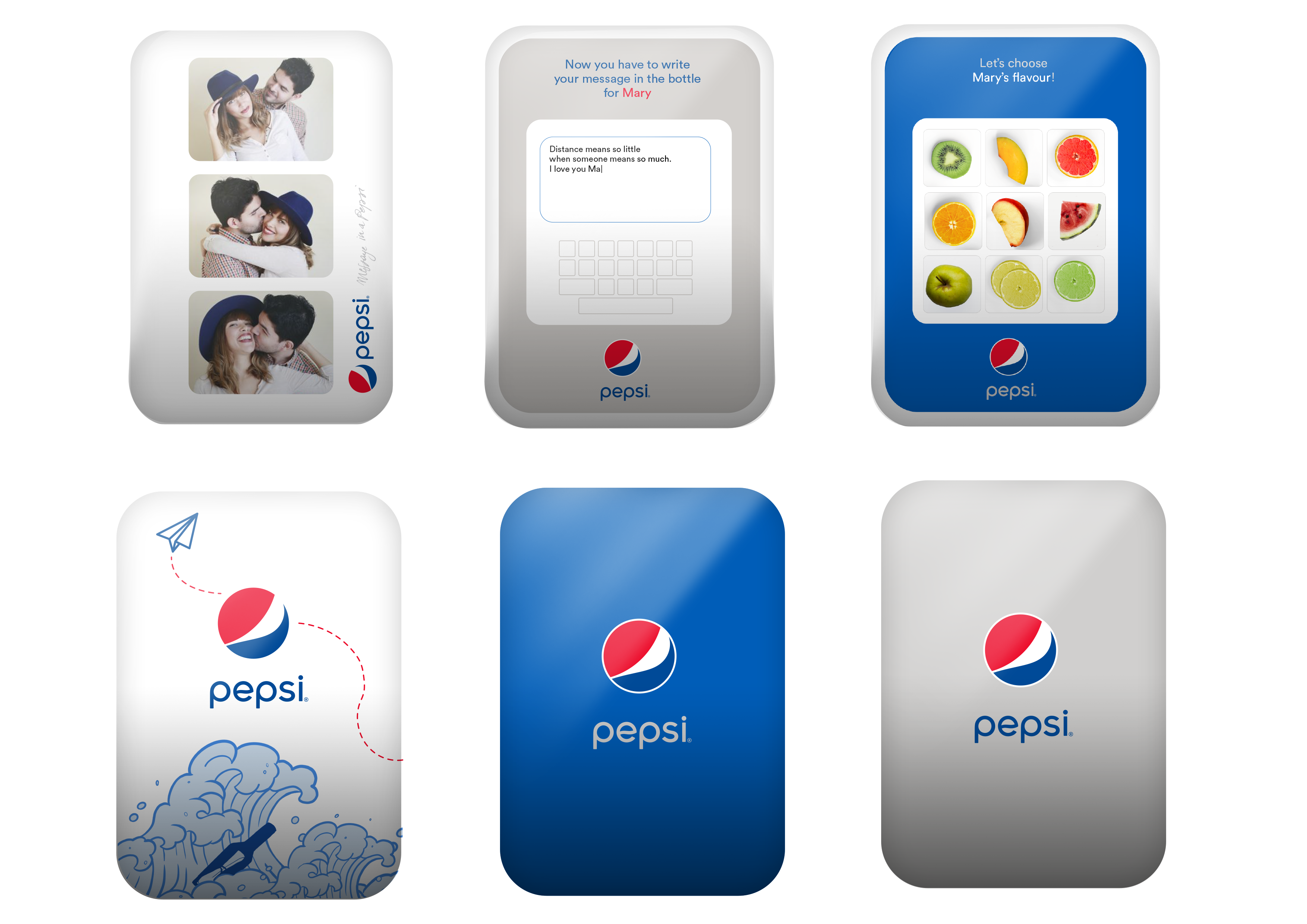 In the one week workshop with SVP & Chief Design Officer at PepsiCo, Mauro Porcini, we were asked to create a new product for the Pepsico brand. The idea that led us to win the workshop is called Message in a Pepsi, which is meant to recall the concept of Message in a bottle, the one sent by sailors and left to sail in the sea. The idea was to create a configurable and eco-sustainable product designed for long-distance couples: at the airport, thanks to a vending machine, the couple that is about to separate can take photos and write a message that will end up in the bottom of the personalised bottle for their partner. The idea is to create a product that will not be thrown away, but will be kept as a sign of your partner's love when you live apart.