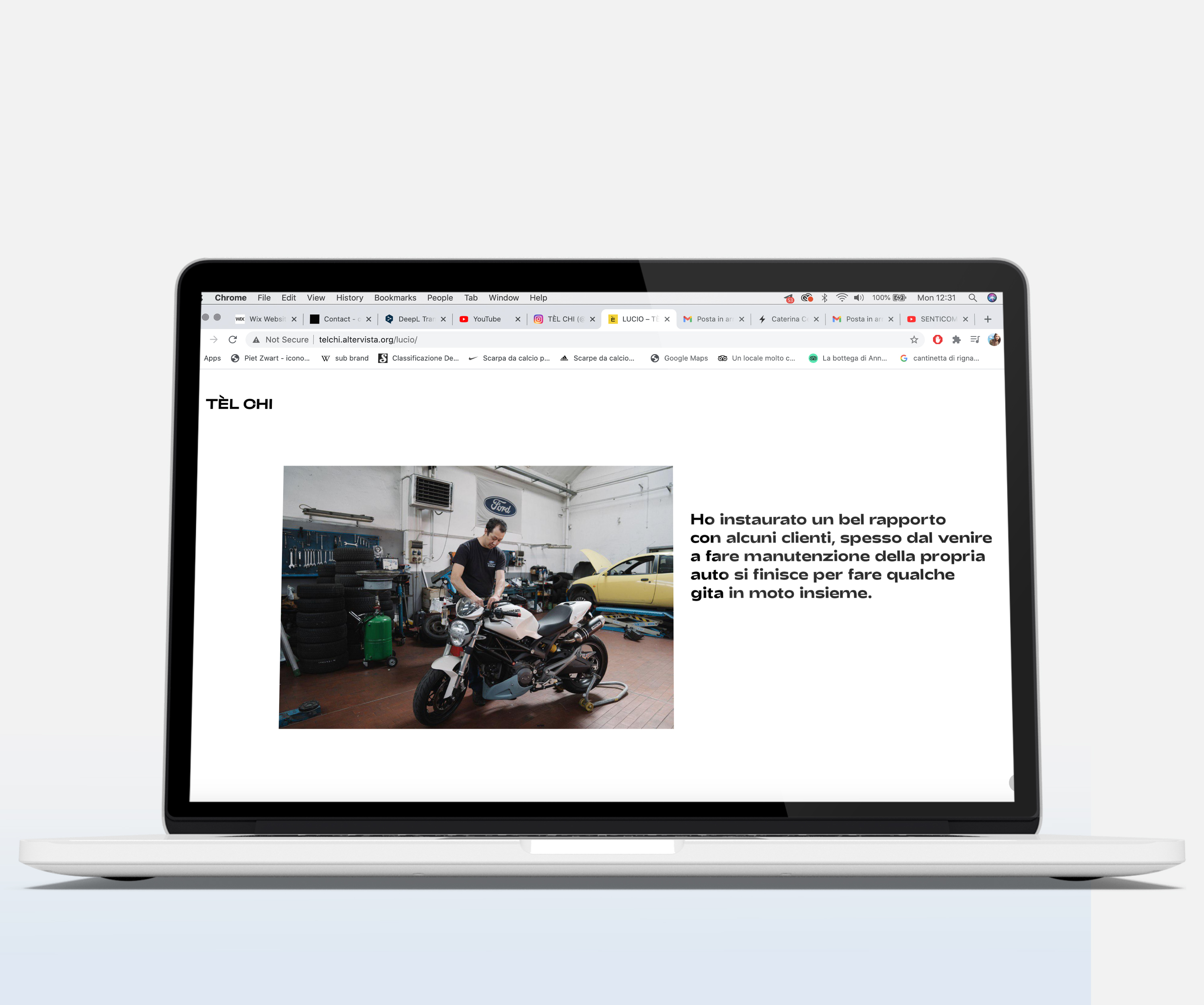 Tèl chi, 'here it is!', is a typical Milanese saying, familiar to every citizen of the metropolis. This website wants to tell you about a side of Milan that is too often forgotten: the humanity of two old men who start talking to you at the bar as if you were their grandson, a humble mechanic in the Bovisa district, a 20-year-old boy who works as a fishmonger at the market in “Via Fauchè”. A photographic reportage accompanies the people's interviews, and a map locates these simple "points of humanity" in this city too often seen only as cold and detached.